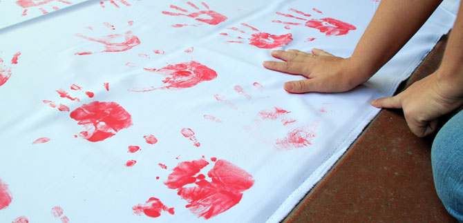 Los transeúntes de la plazoleta del CAM y niños de los colegios de Petecuy pintaron este jueves 12 de febrero sus manos de color rojo, como símbolo de protesta contra el reclutamiento infantil.
