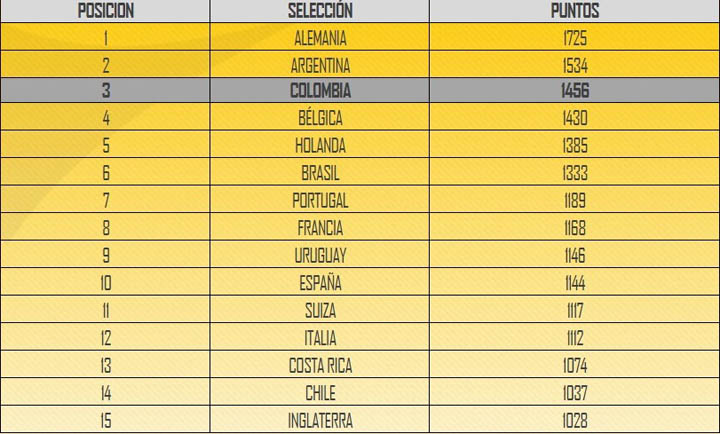Alemania conservó el primer lugar de la tabla con 1725 puntos, seguida por Argentina que perdió 4 puntos y ahora suma 1534, mientras Bélgica le descontó 7 puntos a Colombia y sigue firme en la cuarta posición con 1430 unidades.