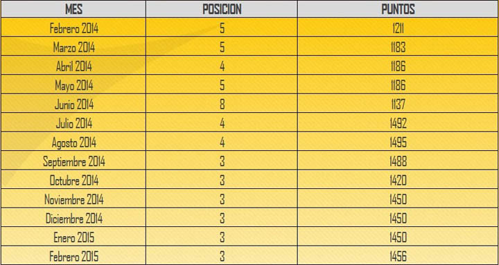Así ha sido la evolución de la Selección Colombia en la Clasificación Mundial FIFA entre febrero de 2014 y febrero de 2015: