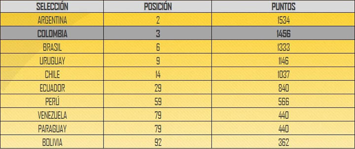 Por los lados de CONMEBOL, Argentina (2), Colombia (3), Brasil (6) y Uruguay (9) siguen en la parte de alta de la tabla, mientras Chile (14) y Ecuador (29) conservaron su ubicación dentro de los 30 primeros equipos de la Clasificación Mundial de la FIFA.