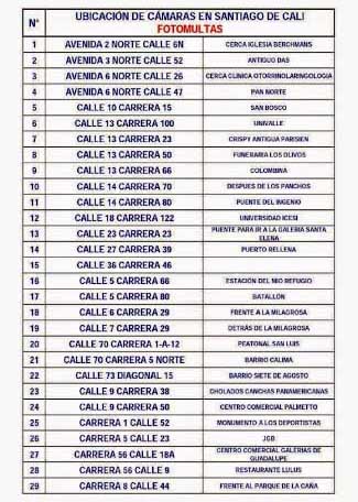 Este es el listado actualizado de las 29 fotomultas instaladas en Cali y a la cual tuvo acceso Caliescribe.com, donde queda en evidencia que solo en el norte, oeste y sur de la ciudad hay operación de estos equipos de foto infracción.
