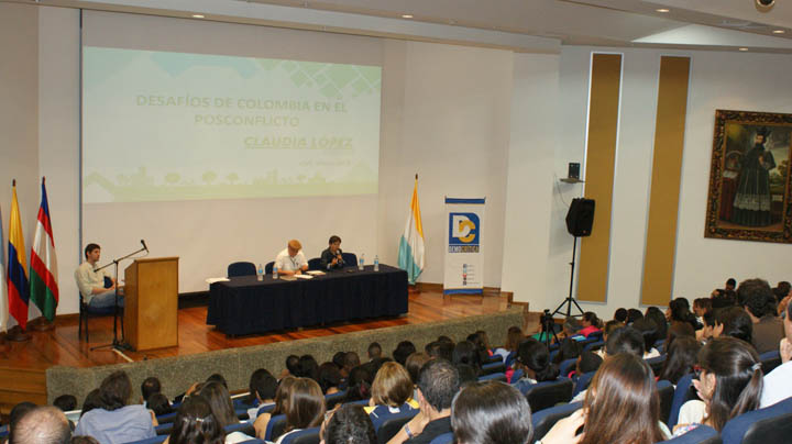 Claudia cautivó al auditorio que la esperó por más de 45 minutos, con frases como “es muy común ver a Roy Barreras haciendo bobadas en el Congreso”. O por ejemplo cuando afirmó “entre Timochenko y Roy, bueno quedémonos con Roy”, lo que despertó la sonrisa generalizada de los estudiantes.