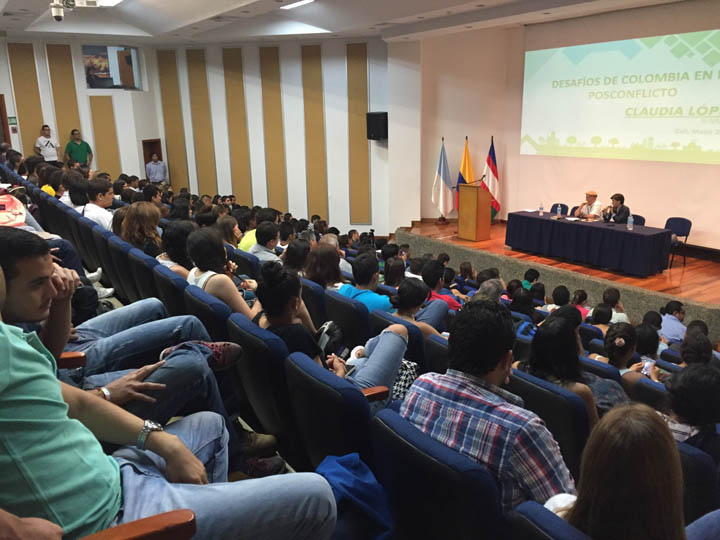 A media marcha, por un esguince en uno de sus pies producto de una mala pisada jugando squash, pero con lleno a reventar, público de pie y especialmente joven, la senadora Claudia López estuvo en la Universidad Javeriana de Cali.